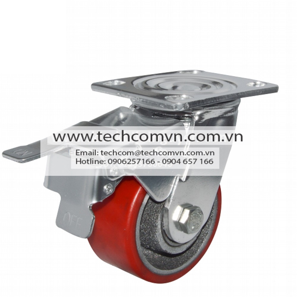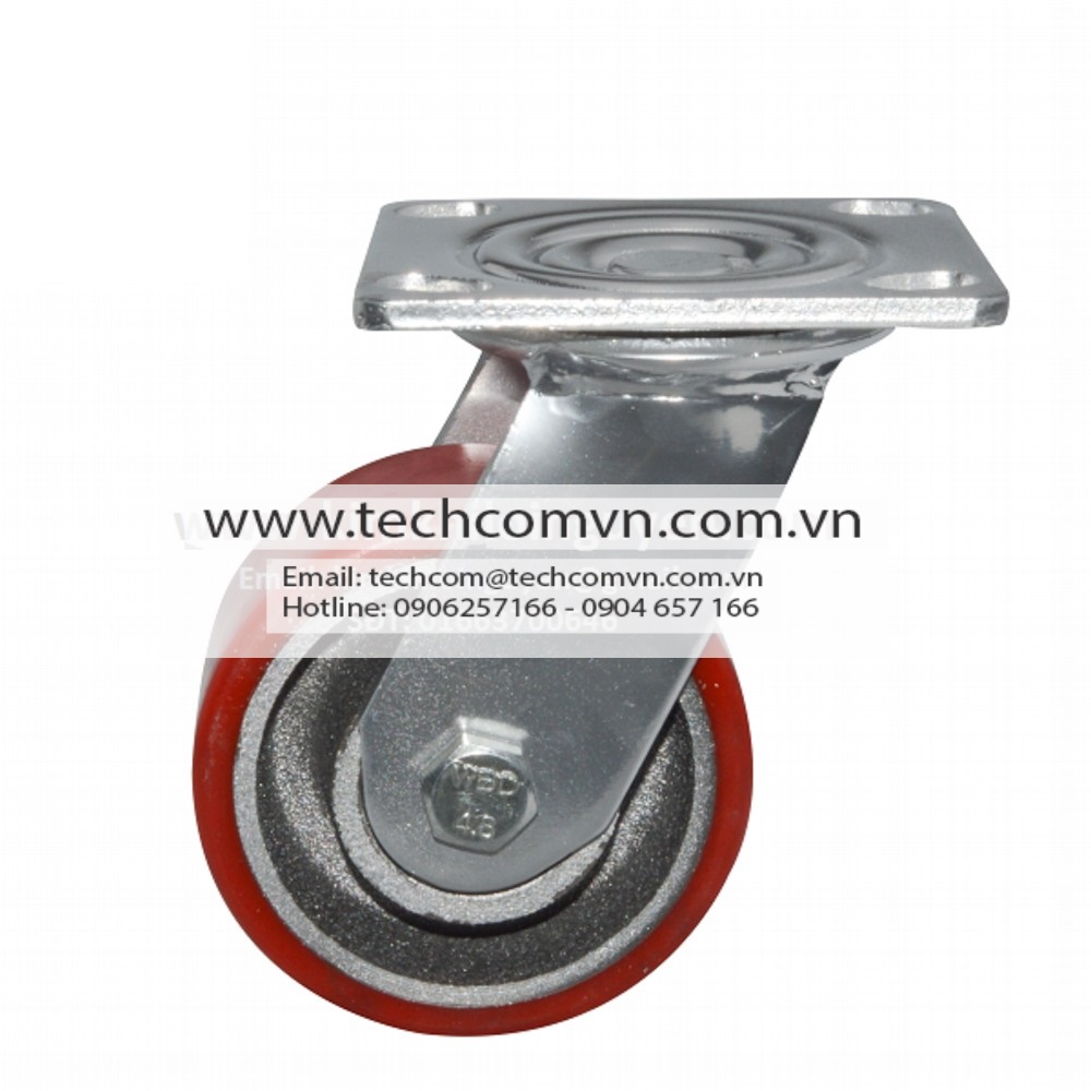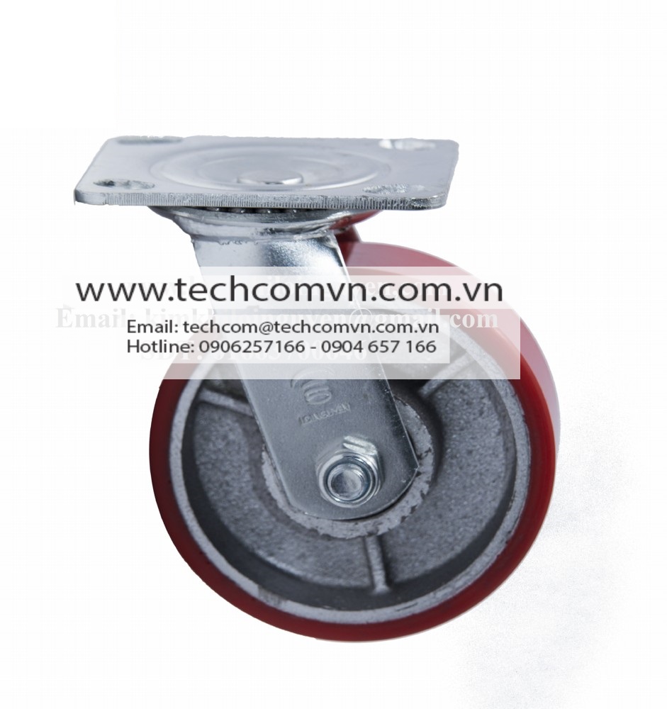 Càng thép và bánh xe PU rất dày, rất nặng. Đây là dòng bánh xe có tải trọng lớn mà TECHCOM VIETNAM đang cung cấp, mỗi bánh xe tải được tới vài tạ. Cổ xoay có bi tì và bi côn nên đảm bảo xoay hướng nhẹ nhàng kể cả khi đang chất tải nặng