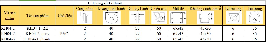 | Đặc điểm riêng | Càng thép và bánh xe PVC rất dày và đẹp. Đây là dòng bánh xe có tải trọng vừa phải mà TECHCOM VIETNAM đang cung cấp, phù hợp với nhu cầu dân dụng. |